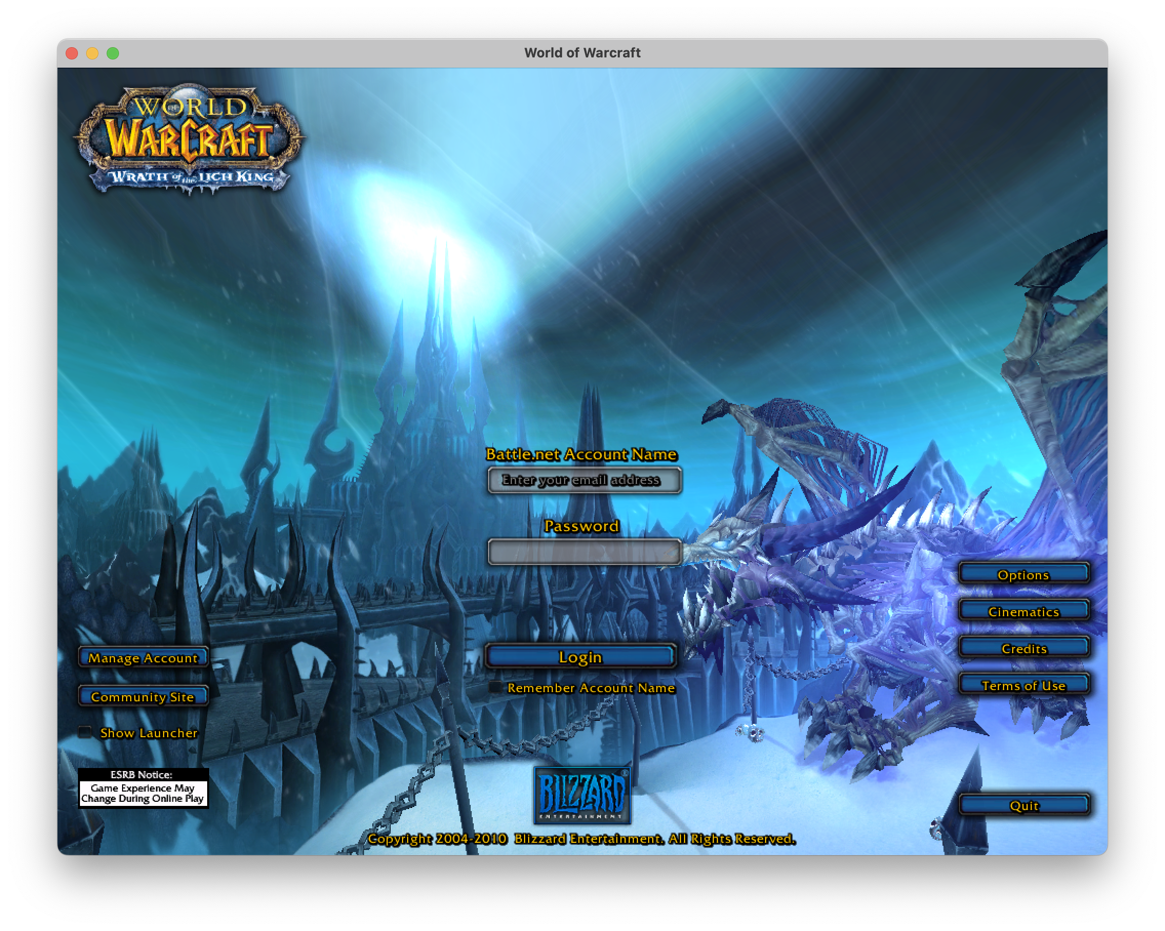 Assuming all goes well, you should be greeted by the login screen, complete with its flying dragon animation loop.